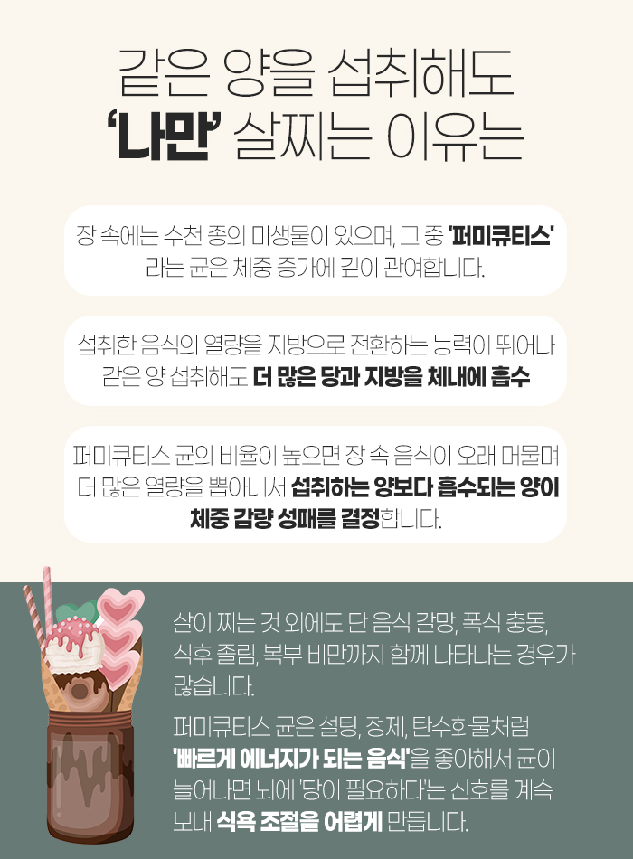 우선 같은 같은 양의 음식을 섭취해도 자신만 살이 찌게 되는 이유에 대해 말해보자면 바로 퍼미큐티스 균 때문인데요. 퍼미큐티스 균은 체중이 증가하는 데 깊이 관여한답니다. 섭취한 음식의 열량을 지방으로 전환하는 능력이 뛰어나기 때문에 같은 양의 음식을 섭취한다고 하더라도 더 많은 당과 지방을 체내에 흡수하게 됩니다.